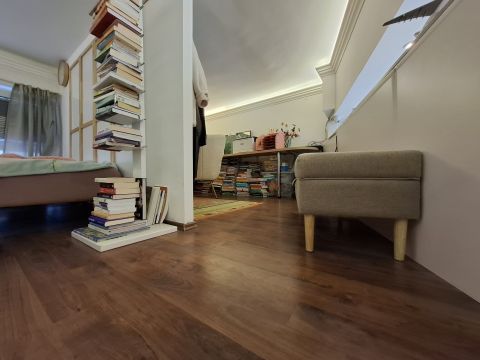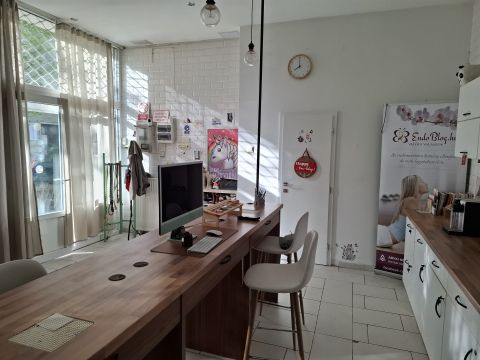 A jelenlegi kialakítás szerint közel 28 m2 az ügyféltér, ahol praktikusan helyett kapott a konyhai rész. A galéria alatti külön bejáratos helyiség az ügyféltérből nyílik, amely kitűnően alkalmas kezelőnek, raktárnak, dolgozó szobának, irodának vagy akár raktárnak. A fürdőszobában tusoló van.
