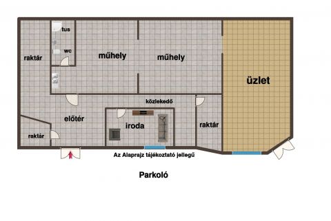 Az ingatlanban kialakítottak egy igényes eladó teret/üzletet,  két műhely részt, irodát, több raktár helyiséget, közlekedő résszel és WC-t, mosdóval, tusolóval