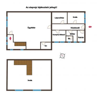 A földszinti rész két külön bejárattal rendelkezik, amelyek közül az egyik közvetlenül az utcáról nyílik, így akár több funkcióra vagy különálló üzleti egységekre is alkalmas lehet.