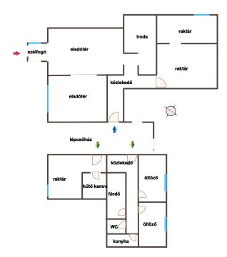 Jelen állapotában üzletként funkcionál, 2 eladó tér, 2iroda, 3raktár, egy hűtőkamra, 2öltöző, konyha ,WC és fürdő lett kialakítva.