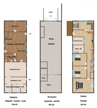 - Főépület, 3 szintes, szintenként 120 m2 amelyből: