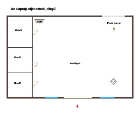 96 m² vendégtér + 3 db WC/mosdó (össz. 15 m²)