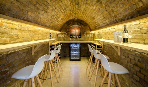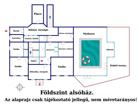 Az épület két, egy nyaktaggal egymáshoz kapcsolt egységből áll. Az új építésű szárny tartalmazza a 6 szobát, az éttermet terasszal és a főzőkonyhát. Ehhez a szárnyhoz kapcsolódik a felújított régi épületrész, amely az iroda-recepciónak, a wellness részlegnek (jacuzzi, szauna,biliárd terem, borospince) valamint egy lakórésznek ad helyet. A lakórész földszintjén egy apartman található (szoba, hálószoba, fürdőszoba, étkező-konyha).
