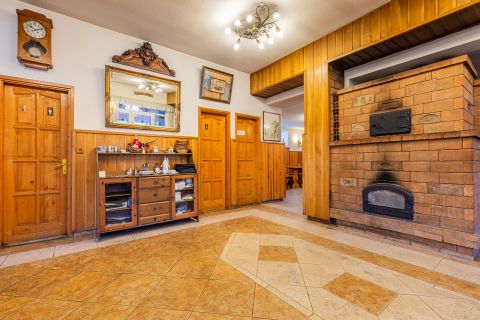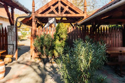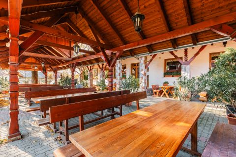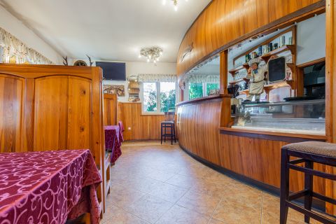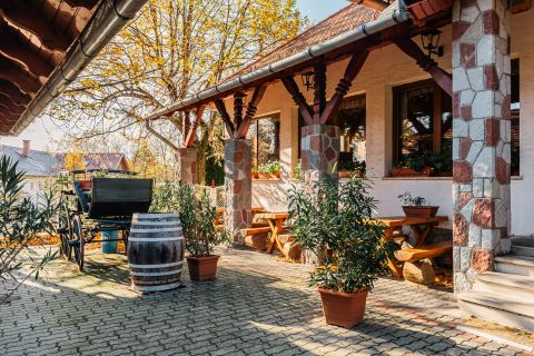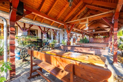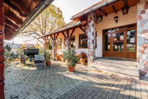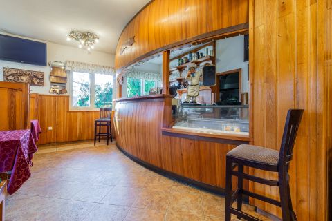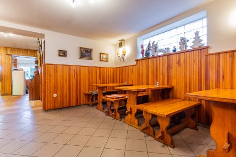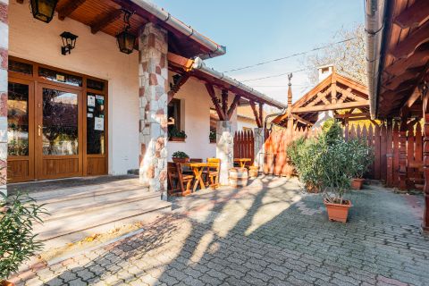 A 885 nm-es telken álló épület hátsó része és az abból nyíló lakás az 1960-as években, míg az étterem nagyobb vendégtere 2002-ben épült. A vendéglő 129 nm, a mellette található 47 nm-es lakásnak a kert felől is van bejárata. Rendelkezésünkre áll még egy 12 nm-es tároló, egy 21 nm-es garázs és a telken önállóan elhelyezkedő 113 nm-es, 2 szint + pince kialakítású ház. Az étterem egyik ékessége a hatalmas, részben fedett terasza és a gyönyörű kemence. Az ingatlan panziónak is tökéletes, a felső szint ennek megfelelően kialakított. Az épület előtt a vendégek számára fenttartott helyeken a parkolás megoldott.