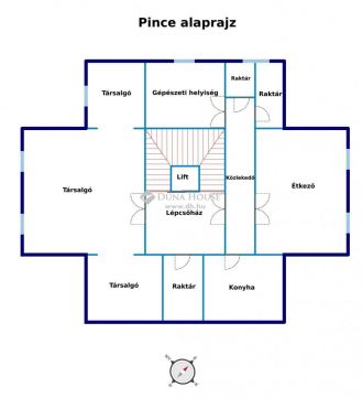 Pince szint: Itt található az étterem, amely 40 fő befogadására alkalmas, továbbá a konyha minden szükséges helyiséggel, kisebb és nagyobb társalgó, valamint egy bárpult.
