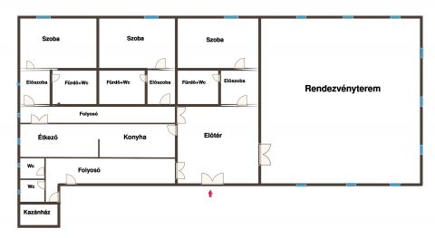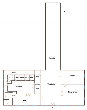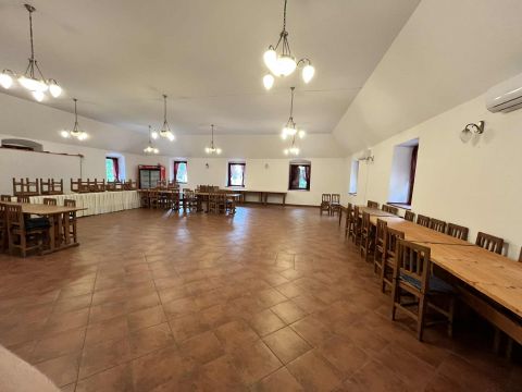 Emelet (2014-es fejlesztés): klimatizált rendezvényterem (akár 200 főig), 3 szoba (ebből 1 akadálymentesített), kiszolgáló melegítőkonyha étellifttel, külön női-férfi mosdók