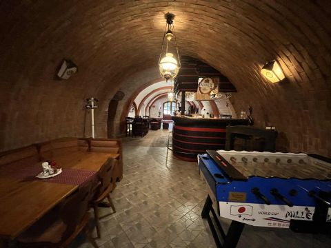 Alsó szint: több vendégtér (80100 fő befogadása), konyha, raktárak, iroda, személyzeti öltöző és mosdók, külön női-férfi mosdó a vendégeknek, valamint egyedi, hordódongákból készült kézműves pult és egy 2 sávos tekepálya
