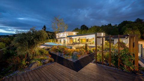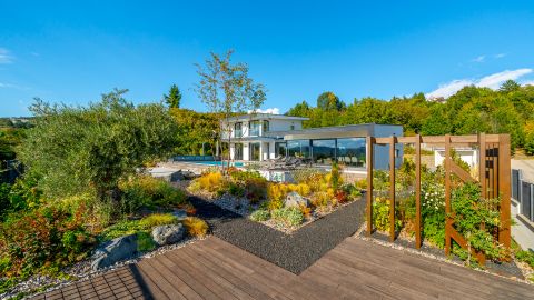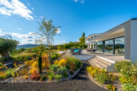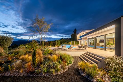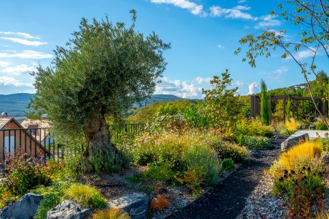 A növényzet nem díszlet: levendula, olajfa, díszfüvek és kőágyások teremtik meg azt a mediterrán hangulatot, amely nyáron élettel tölti meg a kertet, télen pedig elegánsan visszafogott marad.