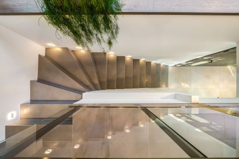 A lépcső, amellyel az emeletre érkezünk, szinte szoborszerű. A lebegő hatású, fényekkel kísért fokok nemcsak közlekedést szolgálnak, hanem finom ritmust adnak a belső térnek – ahogy lépsz, a ház is mozdul veled.