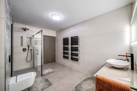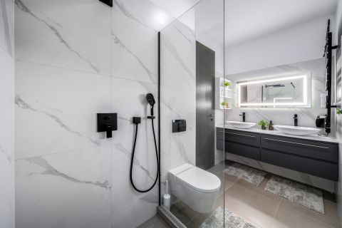 A fürdőszobák az anyagok harmóniájára építenek: kő, üveg és fény dolgozik együtt, hogy a napi rutinból rítus legyen. Minden részlet átgondolt – a burkolatok mintája, a rejtett világítás, a terek aránya mind azt a gondoskodást tükrözik, amely ezt a házat áthatja.