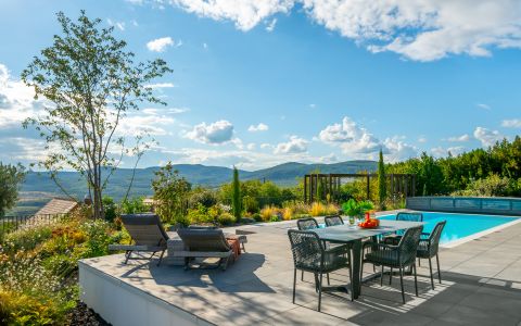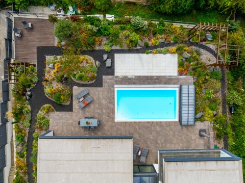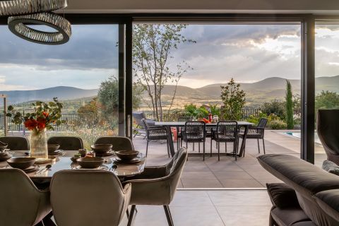 A terasz tágas, természetes kőburkolata a medencével együtt a ház szíve. Itt minden a kilátásra épül – a Pilis lágy ívei, a Duna csillanása és Szentendre fényei alkotják azt a látványt, amely nemcsak díszlet, hanem a mindennapi élet része.