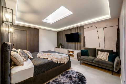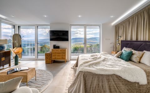 A hálószobák már más hangon szólnak. A főhálóban a mennyezeti ablakon át a nap első fényei puhán szűrődnek be, a falakon természetes tónusok, a textúrák között sötét fa és puha szövet váltakozik. Itt minden a pihenésről szól: a csendről, ami nem üresség, hanem jelenlét.