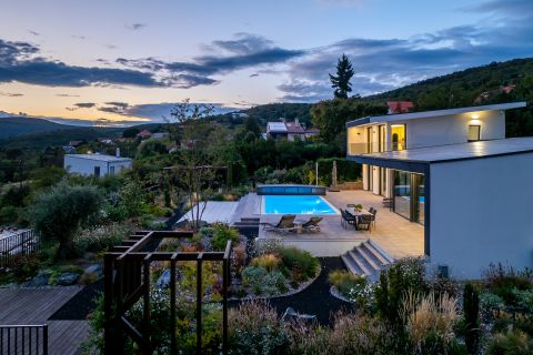 Ahogy a nap lemegy, a medence fénye lassan átveszi a természet szerepét: a víz kékje dereng, a ház üvegfelületein megcsillan az esti fény, és a kert halk esti zsongásában az ember szinte észrevétlenül lelassul.