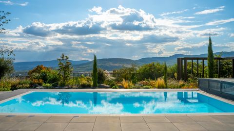 A kert lépésről lépésre tárul fel, mintha egy gondosan komponált sétaút lenne. Az illatos növények és örökzöldek keverednek az évelő virágokkal, majd a tekintet lassan a medence irányába vezet. A víztükör szinte egybeolvad a látóhatárral – az ég és a táj közötti határ elmosódik.