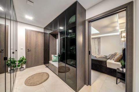 A nappali–étkező–konyha egyetlen folytonos tér, ahol a fény a legfontosabb szereplő. Reggel finoman áttör a függönyökön, délután táncol a márványfelületeken, estére pedig aranyló derűt von a bútorokra. A konyha központi eleme a természetes kősziget, amely egyszerre funkcionális és látványelem – itt zajlik a mindennapi élet, mégis marad benne valami ünnepélyes.