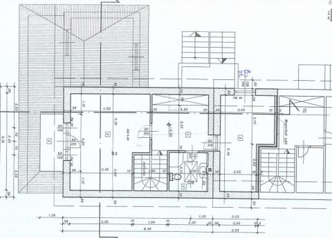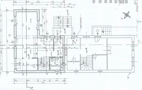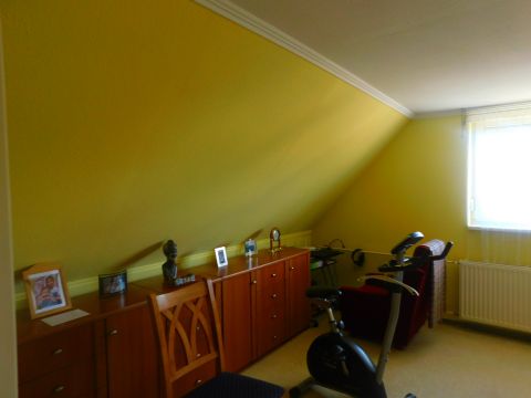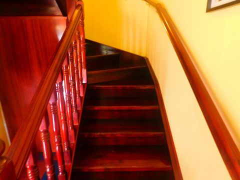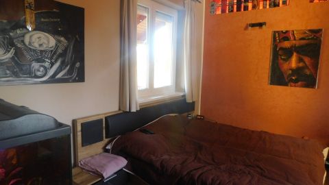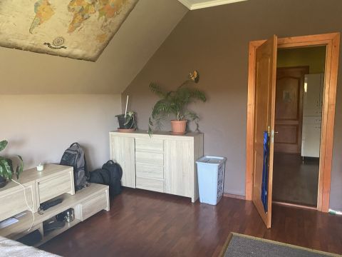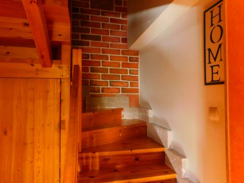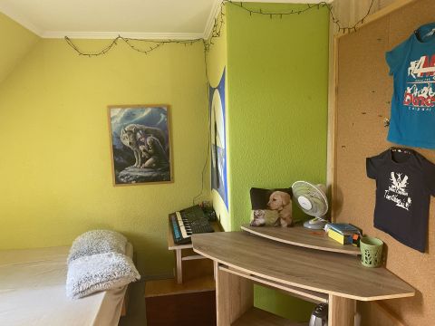 Az emeletre különleges kialakítású falépcső vezet fel. Az emeleten további 2, külön bejáratú szoba, valamint fürdő található. Tágas pince is tartozik a házrészhez.