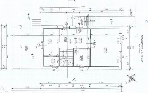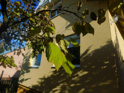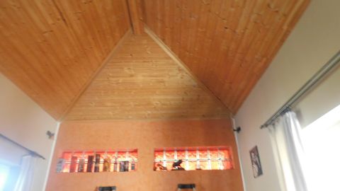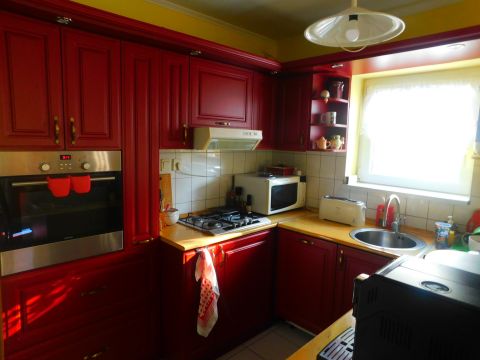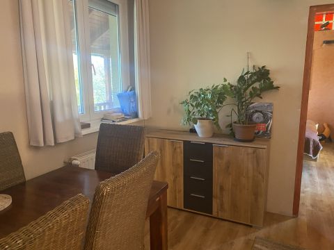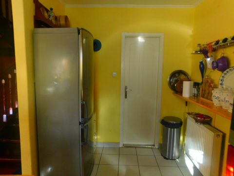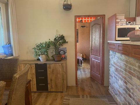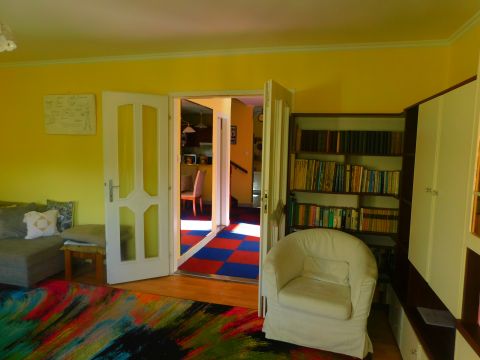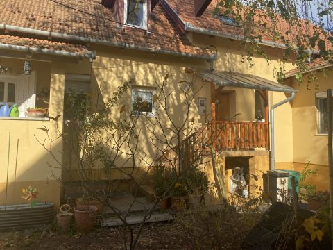 Az első, 95 négyzetméteres házrész ablakai az utcára néznek. A fedett bejáraton a közlekedőn át balra a tágas nappaliba jutunk. Szemben szép fürdőszoba, jobbra hangulatos, meleg tónusú konyha és étkező, továbbá kamra található.