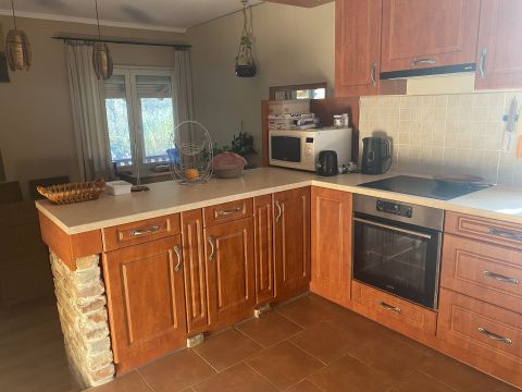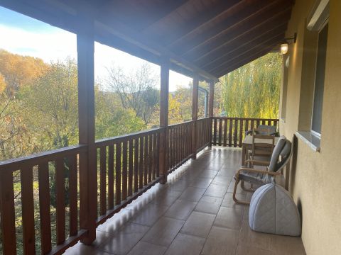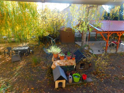 A telken a ház mellett 2 gépkocsi számára alkalmas nyitott beálló található. A kert fáival és bokraival tökéletesen alkalmas a szabadidő kellemes eltöltésére. A telek vége nem határos úttal, így zavartalanul élvezheti a közeli erdők szépségét.