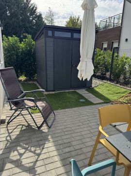 A lekerített, privát kert 12nm-es terasszal nyugodt, intim szférát biztosít, ahol reggel kávézással és este pihenéssel zárhatja a napot. A kertben tároló is kialakításra került.