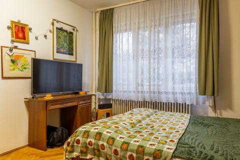 A Pázsit és kertre néző ablakokon keresztül lombkoronák békés mozdulatai, madarak halk játéka és a környék természetes csendje köszönti.