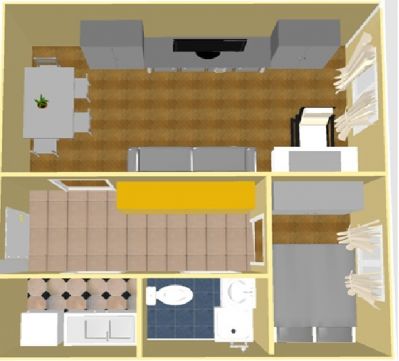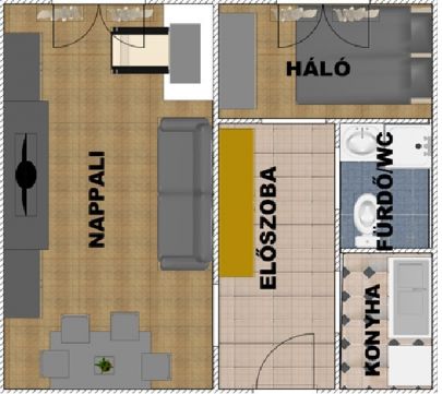 A kis, kompakt lakás jól átgondolt elrendezésű: nappali, hálószoba, konyha, előszoba, valamint fürdőszoba wc-vel található benne. A műanyag nyílászárók redőnnyel felszereltek, így a lakás jól szigetelt és csendes.