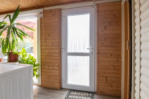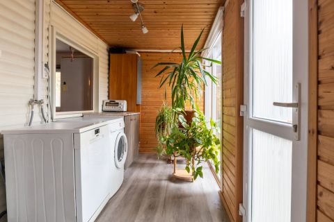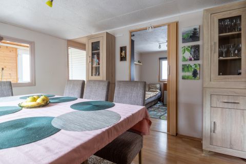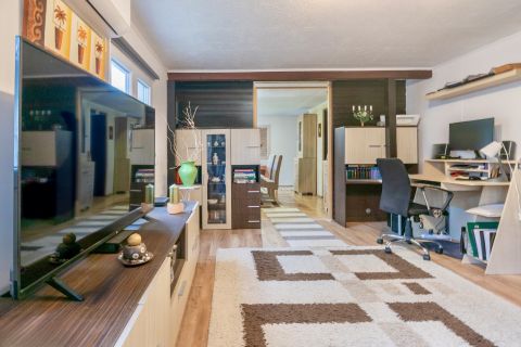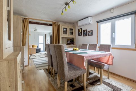 – Elosztása: beépített terasz hatalmas ablakokkal, konyha, tágas étkező, fürdőszoba+WC, nappali, két külön nyíló szoba, hátsó terasz és beépített tároló.