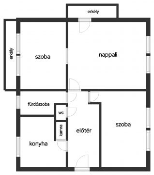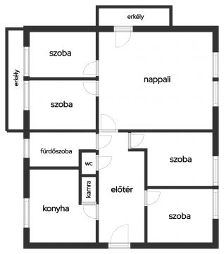 A jelenlegi nappali + 2 hálós elrendezés igény esetén könnyedén visszaalakítható 4 teljes értékű hálószobára — nem apró, hanem normál méretű szobákra.