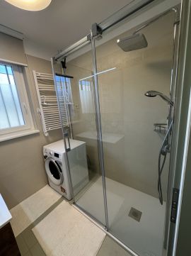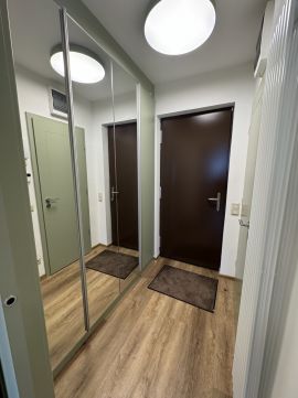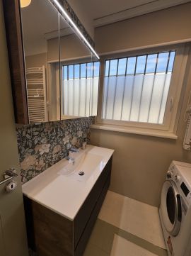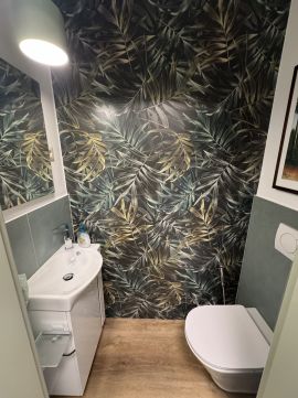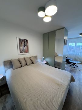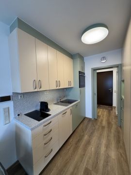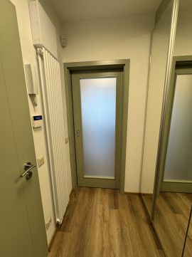 Az előszobába lépve hatalmas tükrös gardrob fogad, ami nemcsak befogad minden kabátot és cipőt, hanem tágas térérzetet ad mindjárt a megérkezéskor. Balra a mosdó aminek hangulatos design csempéje üde színeket ad a helyiségnek. Szemben tovább haladva a gépesített konyhába érkezünk , amely az egész lakás egyedileg gyártott bútoraihoz hasonlóan törtfehér és finom zöld színekben lett kialakítva. A lakás tulajdonképpen egyterű, de a belsőépítész által tervezett bútorok körbehatárolják a konyhát, illetve egy hálószobát, ahol a hatalmas, 180 cm széles kényelmes ágy kapott helyet. A hálóból nyílik a zuhanyzós és ablakos fürdőszoba , ahol mosó-szárítógép is helyet kapott, melynek segítségével nem kell a lakásban ruhaszárítót kerülgetni. Aki már lakott kis lakásban, tudja milyen fontos ez.