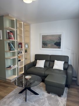 A nappaliban kényelmes kanapé, led világításos könyvespolc, melynek hátsó oldala a háló gardróbja , és kényelmes méretű étkezőasztal kapott helyet.