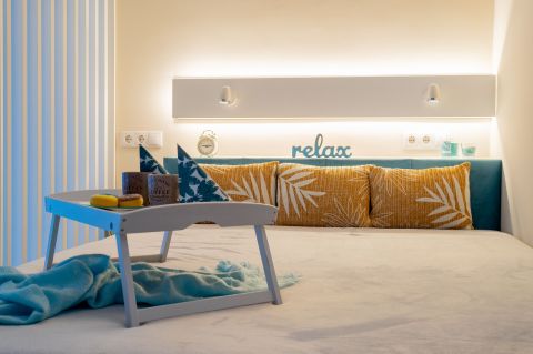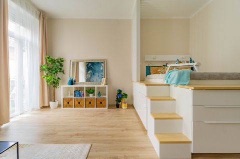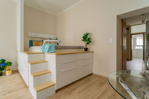A háló rész az ágy megemelésével és egy kis térelválasztóval került kialakításra, ami azért is praktikus mert így az ágy alatt egy kis gardrób lett beépítve.