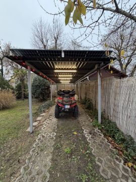 A telken egy nyitott beálló lett építve, mely 2 autó befogadására alkalmas, a kert rendezett, egzotikus fák vannak ültetve, mely mediterrán hangulatot adnak, főleg a melegebb hónapokban.A kert oldalsó részén, két kültéri sátor van, mely a nyári tűző nap elől kínál árnyékot.
