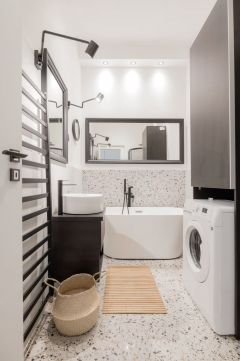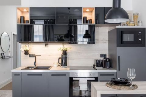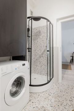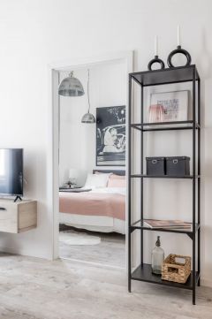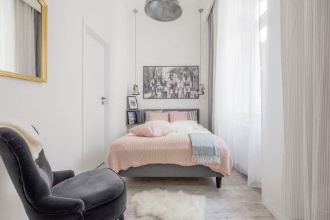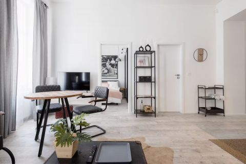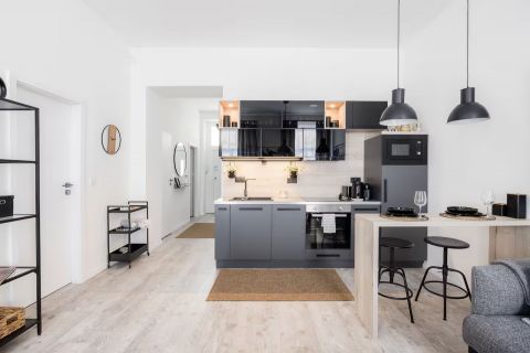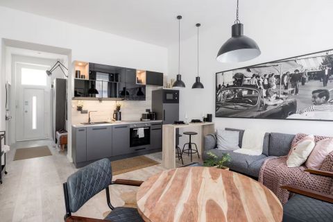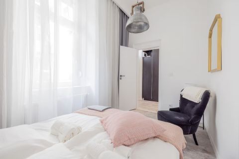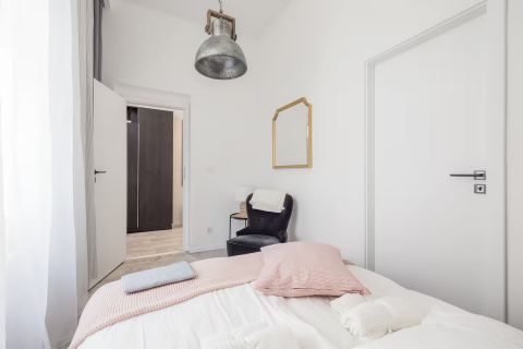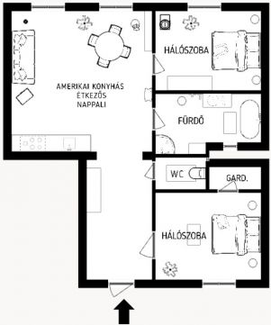 A lakásban egy kellemes méretű amerikai konyhás nappali kapott helyet, illetve egy kisebb és egy nagyobb hálószoba. Az egyik hálóhoz az alaprajzon is látható módon egy kis aranyos gardrób is tartozik. A beérkezésnél elég a tér, és itt is világos a lakás. Van elég hely lepakolni, megérkezni. Az amerikai konyhás nappali utcára néz, de mivel az utca csak egyirányú nagyon csendes. A képeken is látható, hogy gépesített konyha ( mikró, sütő, elszívó, főzőlap, mosogatógép stb. ) várja az új tulajdonost. A kellemes mérető nappaliban kis étkező, pihenő sarok és nappali rész lett kialakítva. Innen nyílik a nagy háló, melyben nagy méretű világítással is felszerelt gardrób szekrény kapott helyet. A fürdő is minden igényt kielégít - végre nem kell dönteni, hogy kád vagy zuhany, ugyanis mindkettő van! Kézmosó, mosógép és törölközőszárító is kellemesen elfér itt. A WC külön van a fürdőtől.