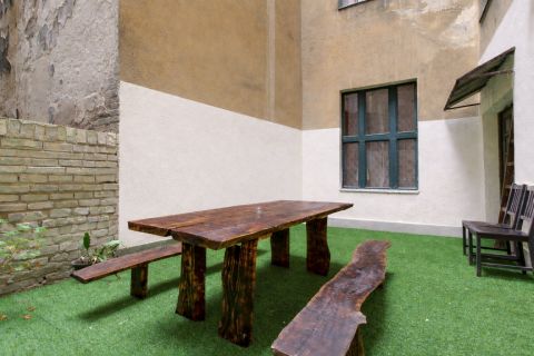 55 m2-es lakás 25m2-es privát udvarral.