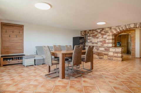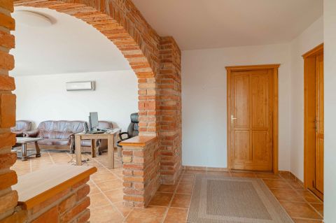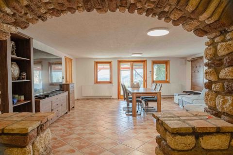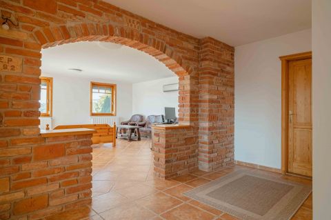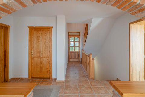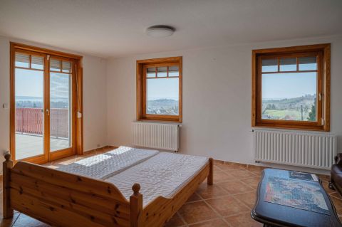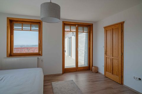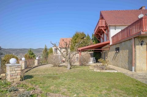 Kényelmes faburkolatú lépcső vezet a következő szintre, ahol egy 36 m2-es panoráma terasz hívogat. Mind a felső nappali, mind a nagyobbik hálószoba teraszkapcsolatos. A nagy hálóból nyíló, ugyancsak panorámát nyújtó fürdő és toalett jakuzzi káddal, zuhannyal és bidével felszerelt. További helyiségek egy vendéháló, második fürdő és egy kis tároló. Mivel ez a lakrész kívülről is megközelíthető és a nappaliban egy konyhasarok kialakításához alkalmas vízes kiállásokat is készítettek, két generáció életéhez vagy több család zavartalan nyaralásához is adottak a feltételek. Csupán érdekességként: a rusztikus dekor tégla falburkolatba pl. az 1800-as évekből származó. G E P (Gróf Eszterházi Pál ) jelölésű darabokat építettek be.