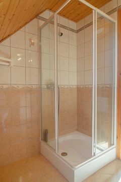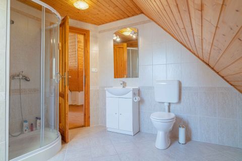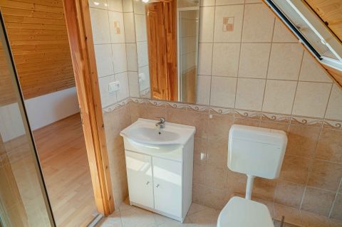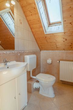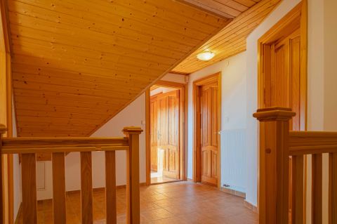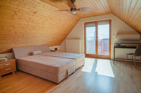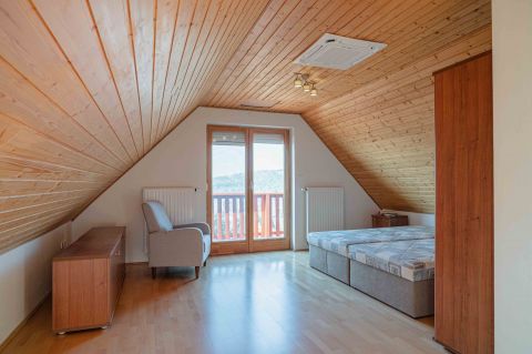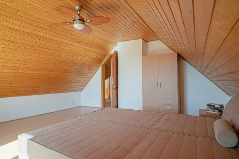 A tetőtérben két háló és fürdő (toalettel) kapott helyet. A szobákból erkélyek nyílnak -már említeni sem kell, milyen kilátással.