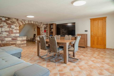 Összefoglalóan: 2 nappali, 4 háló, 4 fürdő 5 db wc van az épületben, + konyha, háztartási helyiség, dupla garázs.
