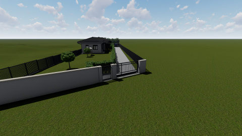 Kerítés: Utcafronton zsalublokkból épített, homlokzati színnel megegyező színre színezett 160 cm magasságban, kiskapuval, kétszárnyú kapuval (max 3,5 m) az autófeljárónál. (Zsalublokk pillérek, homlokzat színével azonos nemesvakolattal) A két tolókapu kézi működtetésű, az automatikának védőcső kiállással. A további oldalakon körbe Kótaji táblás kerítés elemekkel. (A látványterven szereplő telekhatáron lévő kerítések, a funkció megjelenítését szolgálják!)