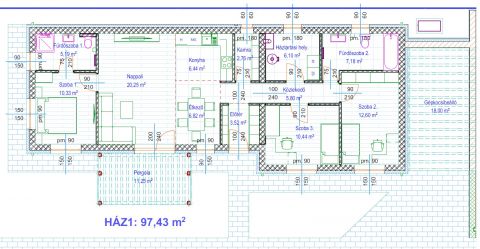 A lakótér 97 nm + 18 nm gépkocsitároló + 11,25 nm terasz