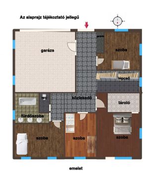 Az emeleten négy kényelmes félszoba, valamint egy tágas fürdőszoba, WC és tárolóhelyiség kapott helyet.