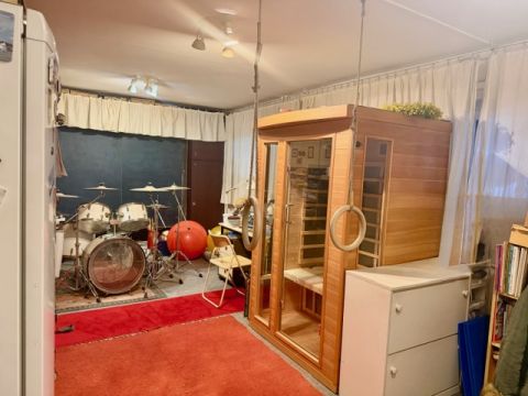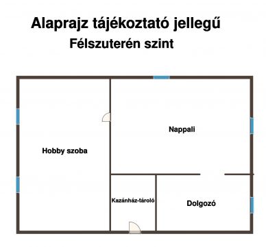 Földszinről lépcső vezet le az alsó félszuterén részre, ami egy tágas kandallós nappaliból és két külön szobából áll, továbbá helyet kapott itt egy infra szauna is, mely a vételár részét képezi.
