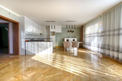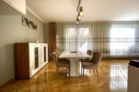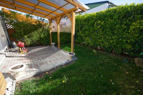 A ház kétszintes. A földszinten található helyiségek: előszoba, szoba, fürdőszoba WC-vel, lépcső alatt található beépített tároló/gazdasági helyiség vízlágyítóval, tágas, kertkapcsolatos amerikai konyhás nappali, beépített konyhabútorral (mosogatógép, elektromos sütő, főzőlap).