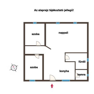 A bejárati ajtón belépve egy konyha-előszobába érkezünk, ahonnan a nappali-étkező rész nyílik.