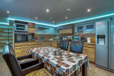 A szuterén szint külön funkcionális tereket kínál: itt található egy fürdőszoba zuhanyzóval és WC-vel, egy külön horgászszoba, spájz, mosókonyha, valamint egy gépészeti helyiség is, külön internet csatlakozással.