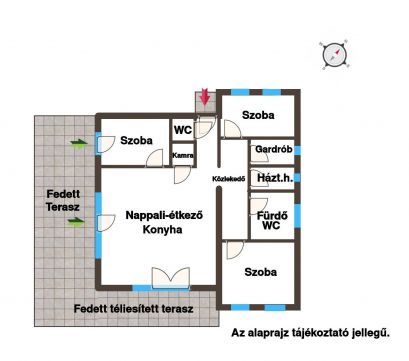 62 m²-es fedett terasz, melynek kb. fele téliesített