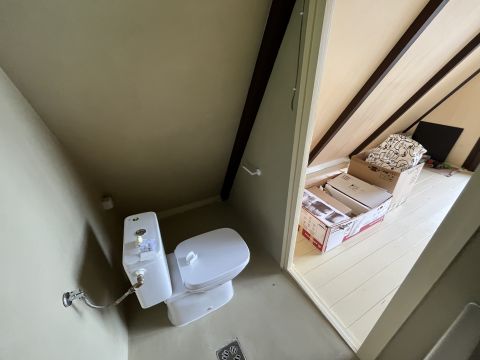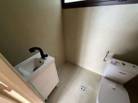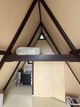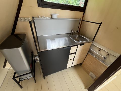 Külső lépcsőn keresztül jutunk fel a lakótérbe, ahol egy kisebb nappali-konyha és egy mosdó kapott helyet.
