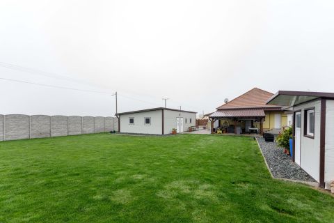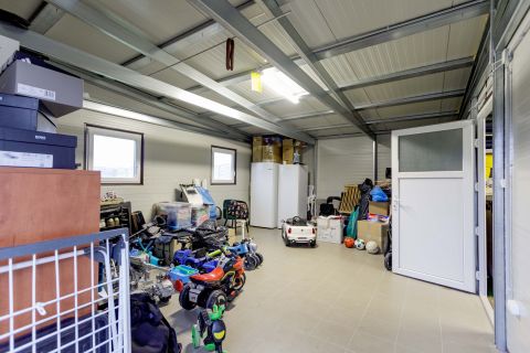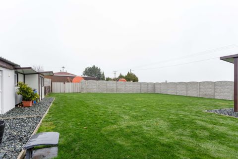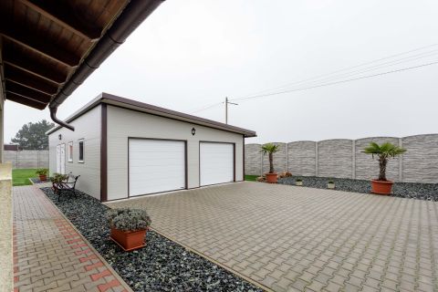 A kert igazi ékszerdoboz: füvesített, öntözőrendszerrel ellátott, robotfűnyíróval karbantartott, dupla garázzsal és tárolókkal felszerelt. Az elektromos kapuk pedig a kényelmet szolgálják.