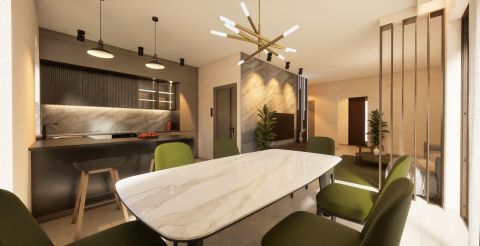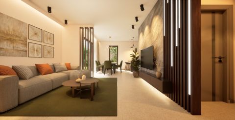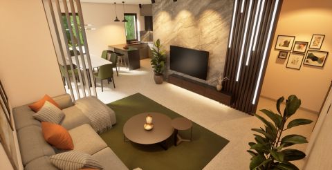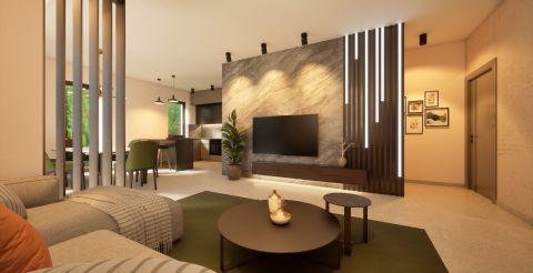 A praktikus elosztásnak köszönhetően az otthon 4 szobát kínál, amerikai konyhás nappalit - étkezővel, 3 hálószobát, fürdőszobát, háztartási helyiséget, kamrát, előszobát és egy burkolt teraszt.