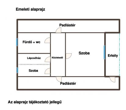 Emelet: szoba, félszoba, fürdő+wc, közlekedő