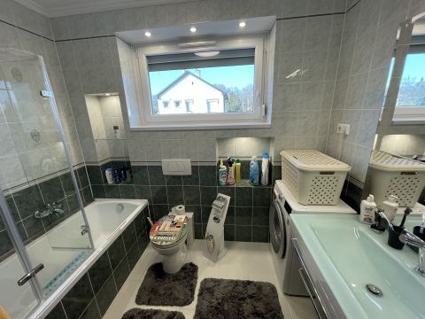 Az ingatlan kialakítása rendkívüli figyelmet fordít a fény és tér harmonikus együttélésére. A kertre néző kilátás, a bőséges napfény, valamint a gáz cirkó fűtés biztosította meleg teszi ezt a lakást otthonossá minden évszakban. Két különálló, ablakos fürdőszoba szolgálja a lakók kényelmét: az egyik kádas, a másik pedig épített zuhanyzóval rendelkezik, míg a földszinten külön WC található.