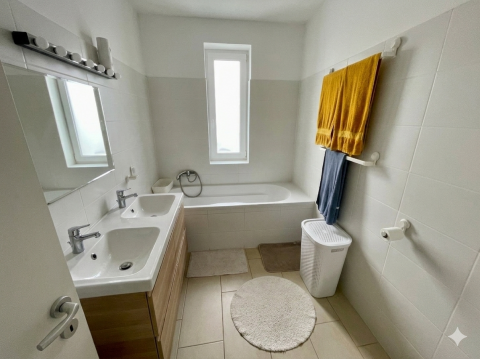 Garázs és Gépészet: A két lakást a garázs köti össze. A garázsban található a 300 literes HMV tartály, aminek köszönhetően a helyiség télen is tartja a 16-17 fokot. A kényelmet szigetelt elektromos garázskapu biztosítja.